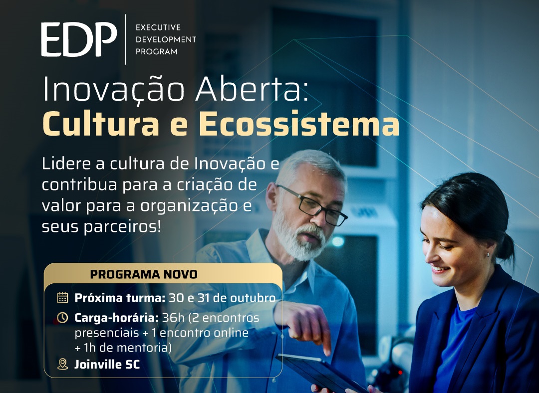 Florianópolis, 07.10.2024 – A Academia FIESC de Negócios está com inscrições abertas para o programa de desenvolvimento executivo EDP Inovação Aberta: Cultura e Ecossistema, com Fábio Luiz Caramori, especialista em Inovação e Desenvolvimento de Negócios.