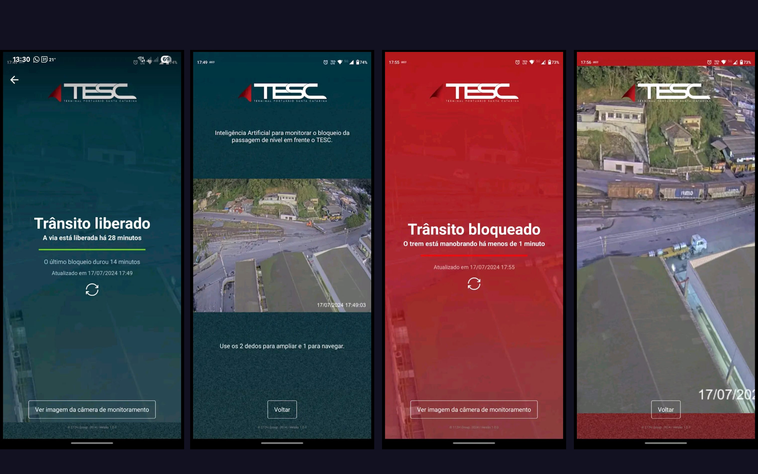 O aplicativo informa se a via de acesso está liberada ou bloqueada devido à passagem do trem, permitindo assim a escolha do melhor trajeto. A interface muda de cor, verde ou vermelho, conforme o status da via. Quando a via está bloqueada pela passagem de um comboio ferroviário, o APP TESC cronometra o tempo da duração do bloqueio e informa o tempo de duração do bloqueio anterior.