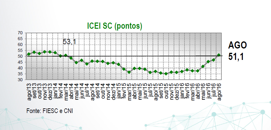 Florianópolis, 17.8.2016 – Após dois anos e meio, os industriais catarinenses retomaram a confiança na economia. O Índice de Confiança do Empresário Industrial Catarinense (ICEI) passou de 46,9 pontos em julho para 51,1 pontos em agosto, ultrapassando a linha divisória dos 50 pontos, que separa o otimismo do pessimismo. A pesquisa foi realizada pela Federação das Indústrias de Santa Catarina (FIESC) e pela Confederação Nacional da Indústria (CNI), com 207 empresas dos segmentos de transformação e construção civil.