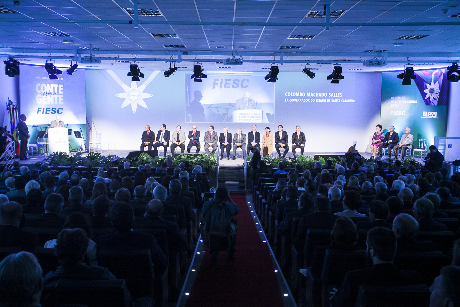 Florianópolis, 20.5.2016 – A cerimônia de entrega da Ordem do Mérito Industrial e do Mérito Sindical, realizada nesta sexta-feira (20), em Florianópolis, reconheceu os industriais Cecília Ana Rubini Menegotti (Malhas Menegotti), Cesar Gomes Junior (Portobello), Colombo Machado Salles (ex-governador de SC) e Ninfo Valtero König (Atrio Hotéis). A solenidade marcou o encerramento da 5ª edição da Jornada Inovação e Competitividade da Indústria Catarinense, evento que a entidade realizou de 18 a 20 de maio, em Florianópolis, com mais de 4 mil participantes. Clique aqui para assistir à integra da cerimônia.