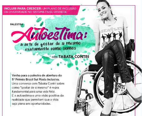 Florianópolis, 21.11.2017 – A atriz e cadeirante Tabata Contri será a palestrante que abrirá o 5º Prêmio Brasil Sul de Moda Incusiva. A conversa vai abordar o tema autoestima e sobre como gostar de si mesmo. O evento, promovido pelo SENAI/SC e pelo Instituto Social Nação Brasil, marca o encerramento do Plano Incluir para Crescer – iniciativa de inclusão das entidades da FIESC, e terá colaboradores com deficiencia da Federação participando como modelos para os projetos de moda inclusiva do SENAI.