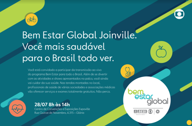 Florianópolis, 26.07.2017 – A cidade de Joinville recebe pela primeira vez o Bem Estar Global na próxima sexta-feira, dia 28. O evento – uma iniciativa do SESI em parceria com a Rede Globo – oferece serviços de saúde e qualidade de vida, shows e aulas de diferentes ritmos à população. O programa ‘Bem Estar’ será apresentado diretamente do local, ao vivo.