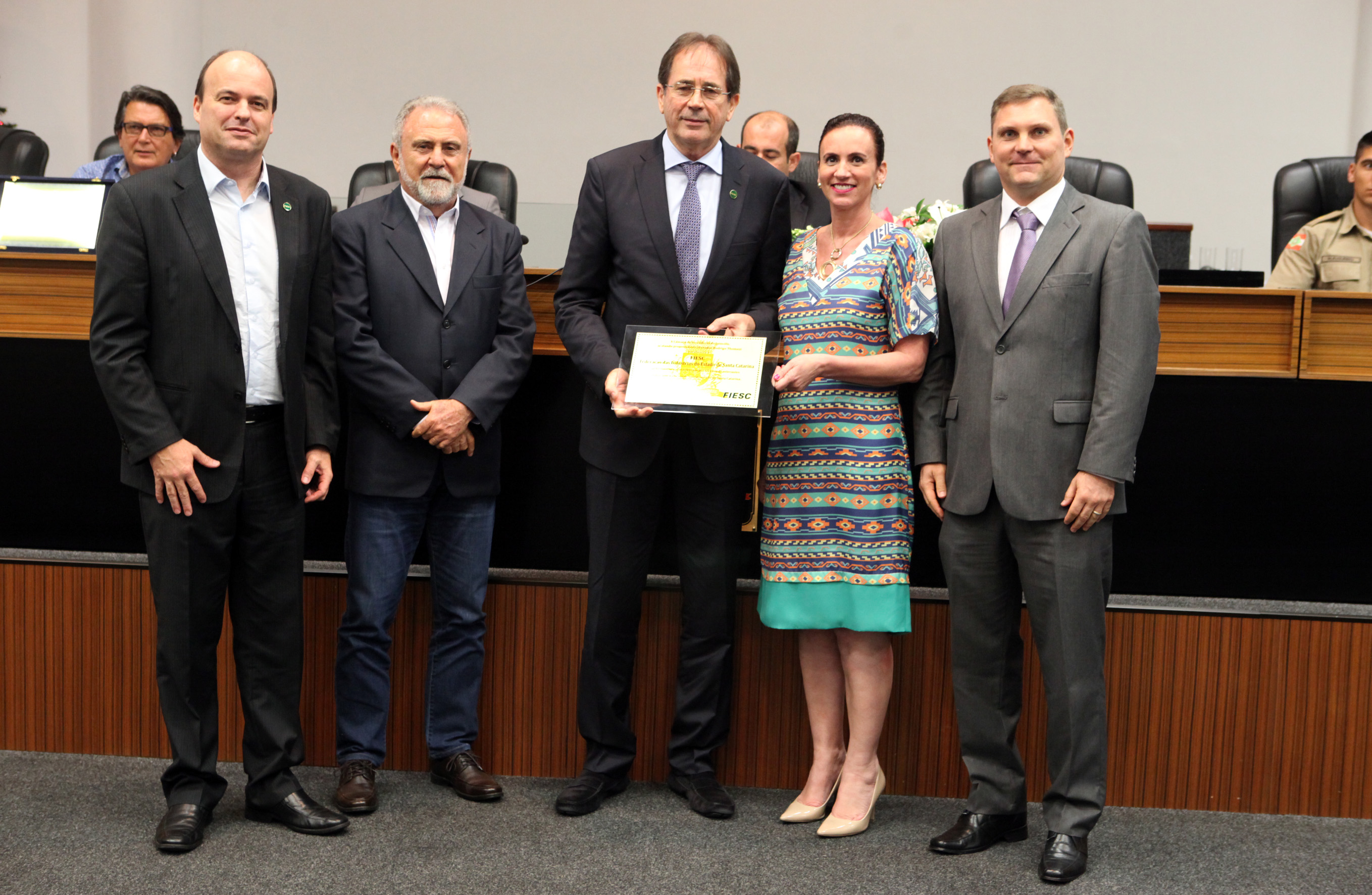 Joinville, 15,12.2016 - A Federação das Indústrias de Santa Catarina (FIESC) recebeu homenagem da Câmara de Vereadores de Joinville pelos 65 anos de fundação, em Sessão Solene realizada na noite desta quarta-feira, dia 14. Mario Cezar de Aguiar, 1º vice-presidente, representando a FIESC, destacou o orgulho de receber a homenagem. “O evento desta noite é uma oportunidade para relembrar um pouco da história da Federação das Indústrias, fundada em 25 de maio de 1950 por sete sindicatos de empregadores. Mas é também momento para mostrar como a instituição cresceu junto com a indústria catarinense e hoje tem papel decisivo para a competitividade do setor”, pontuou.