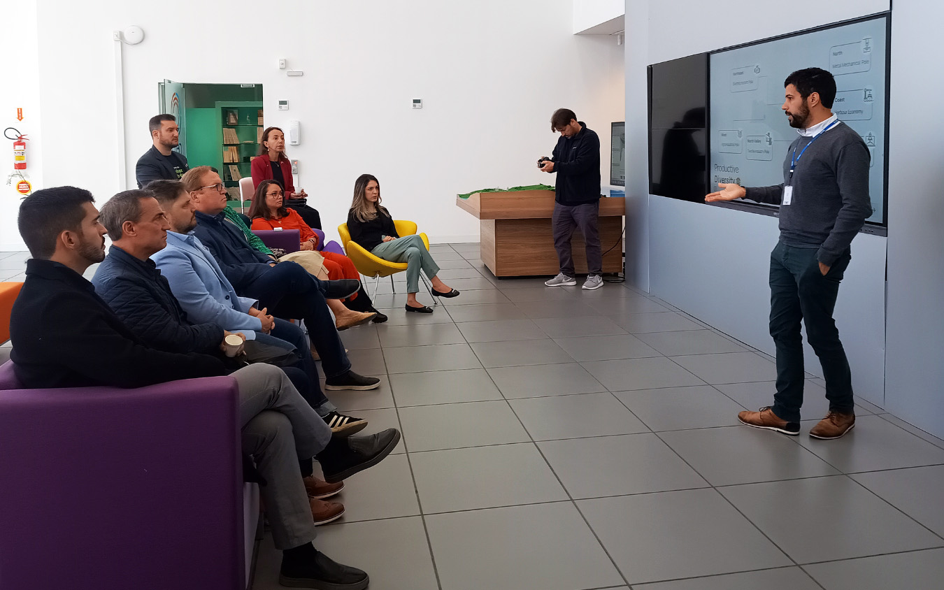 Florianópolis, 13.8.2024 – Uma delegação de empresários e acadêmicos do Canadá e de brasileiros que vivem naquele país visitou o Instituto SENAI de Inovação em Sistemas Embarcados, nesta terça-feira (13). O grupo está em Florianópolis para participar do Startup Summit e aproveita para conhecer o ecossistema de inovação da região.