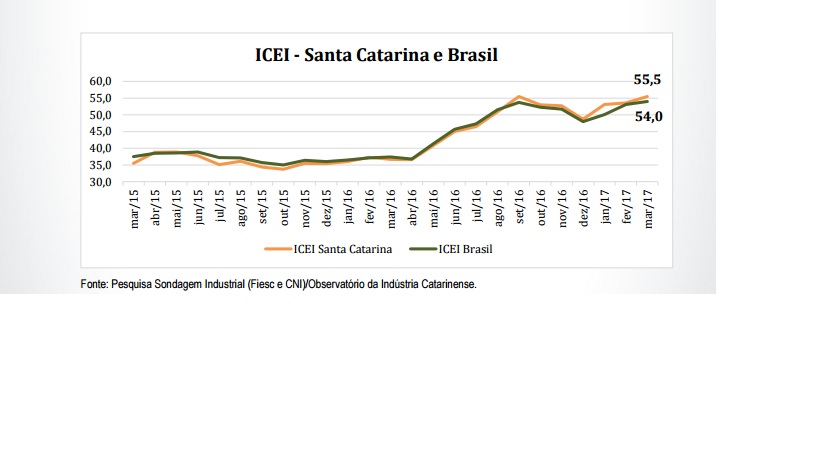 As expectativas dos industriais catarinenses mantiveram-se otimistas em março e alcançaram (55,5 pontos), ampliando-se a trajetória de crescimento iniciada em dezembro, mostra a pesquisa Índice de Confiança do Empresário Industrial (ICEI), realizada pela Federação das Indústrias de Santa Catarina (FIESC). O índice varia no intervalo de 0 a 100. Acima de 50 pontos indica confiança e abaixo, falta de confiança na economia. Segundo o levantamento, o desempenho reflete um quadro macroeconômico menos dramático, com expectativa de estabilização da renda nacional, grande redução dos níveis de inflação e das taxas de juros, além da valorização do real.
