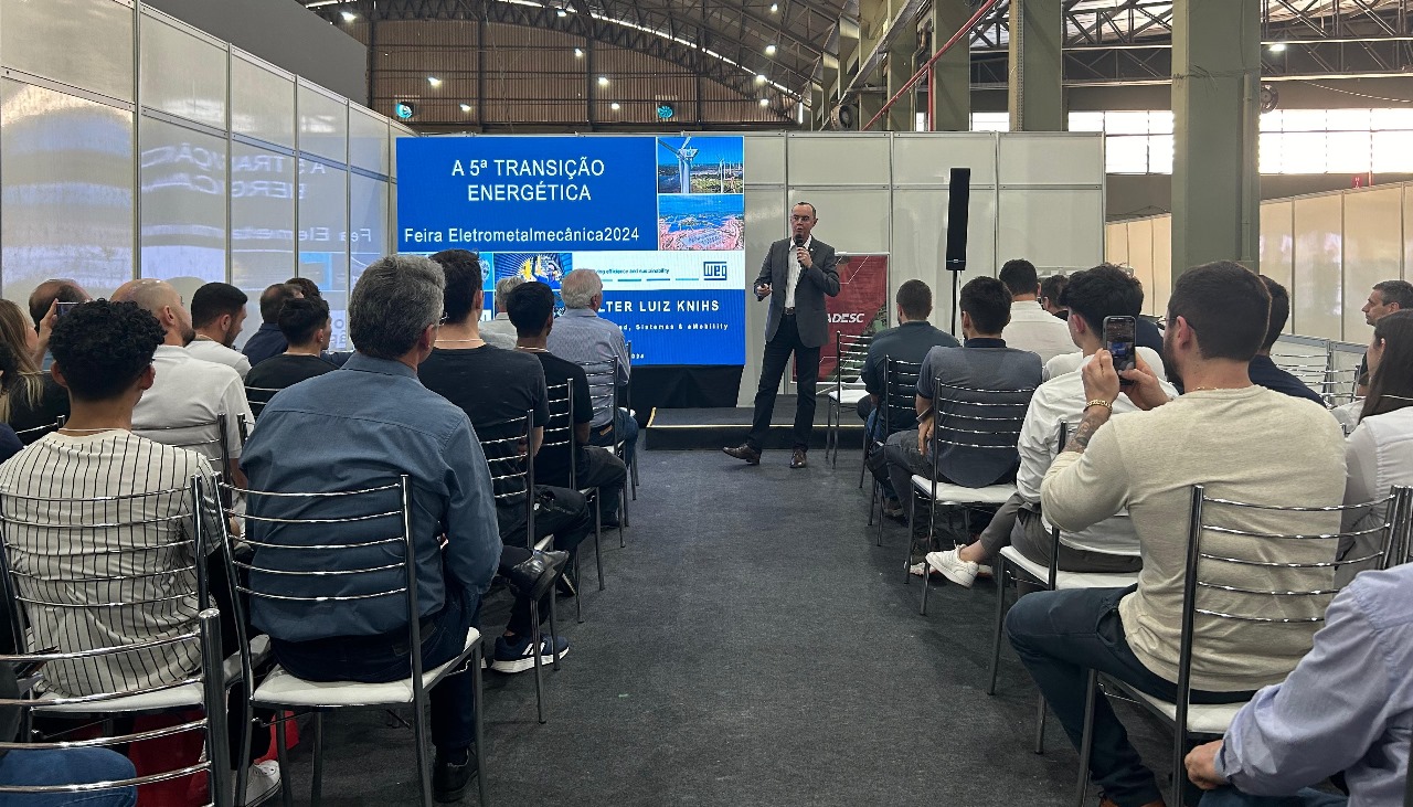 Florianópolis, 19.9.2024 - A demanda global por energia elétrica deve triplicar até 2050 e 95% dos novos suprimentos virão de fontes renováveis. Associado a isso, o nível do mar deve se elevar em até 2,5 metros até o final do século, ameaçando mais de 600 cidades no planeta. Estes são alguns dos desafios do setor de energia que a humanidade terá que enfrentar nas próximas décadas e que foram apontados pelo diretor industrial da WEG Digital e Sistemas & eMobility, Valter Luiz Knihs, na palestra intitulada “A quinta transição energética”, durante a Feira e Congresso de Tecnologia para a Indústria Eletrometalmecânica 2024, em Chapecó.