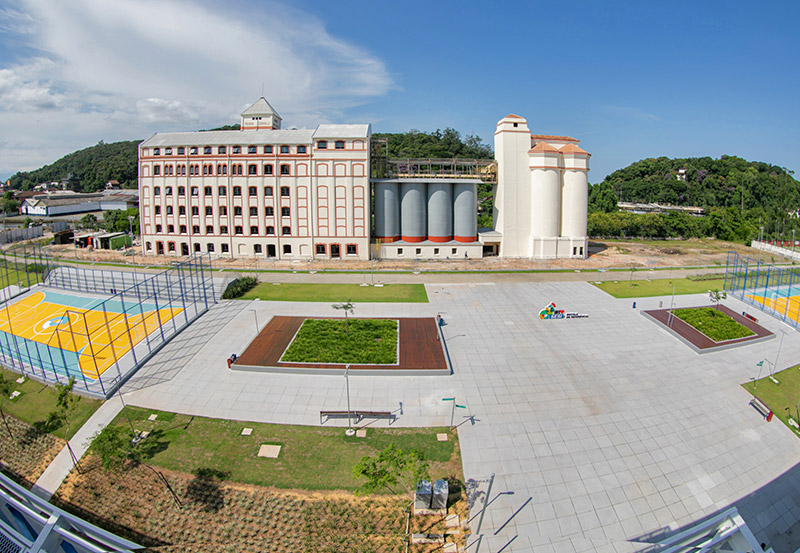 Arquitetura | O Moinho restaurado é imponente e se destaca no contexto do complexo. Os prédios da escola são horizontais, ao estilo escandinavo, e ocupam a grande extensão do terreno sem suprimir visualmente aquela que é uma das mais antigas referências industriais de Joinville, tombada pelo Patrimônio Histórico Municipal. “A arquitetura dos prédios, com amplos espaços abertos, incentiva o florescimento e a troca de ideias e favorece a criatividade”, diz Marco Aurélio Goetten, gerente executivo do SESI e do SENAI na região de Joinville, que destaca também os laboratórios de informática, os espaços Maker (para aulas “mão na massa”) e as amplas quadras esportivas, que valorizam o movimento e a vida ao ar livre.