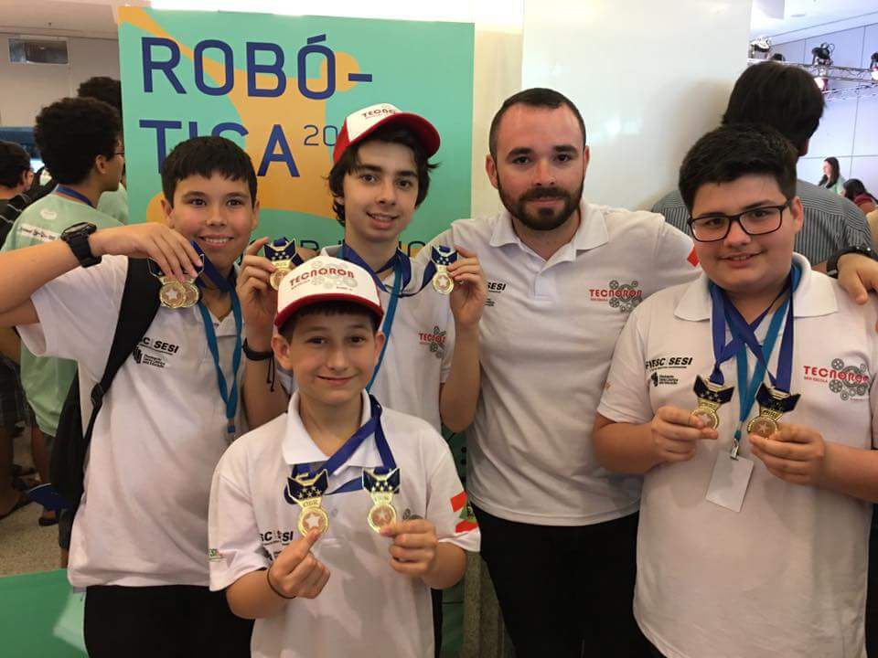 Florianópolis, 14.10.2016 – Os estudantes catarinenses que participaram da etapa nacional da Olimpíada Brasileira de Robótica foram reconhecidos pela criação de um dos melhores robôs da competição. Cleber Alves Junior, Arthur Gabriel Silveira Sophiatti, Bernardo Victoria Escobar Silva e Nicolas Patrick Souza, alunos do SESI Escola de Brusque, ganharam o Prêmio Extra Robustez, que coroa os alunos da equipe que produziu o robô mais robusto (excetuando a campeã da competição, que foi uma escola de Recife-PE). A olimpíada foi realizada em Recife-PE, de 9 a 12 de outubro, e teve apoio do CNPq. O objetivo é estimular as carreiras científico-tecnológicas, além de promover debates e atualizações sobre o tema.
