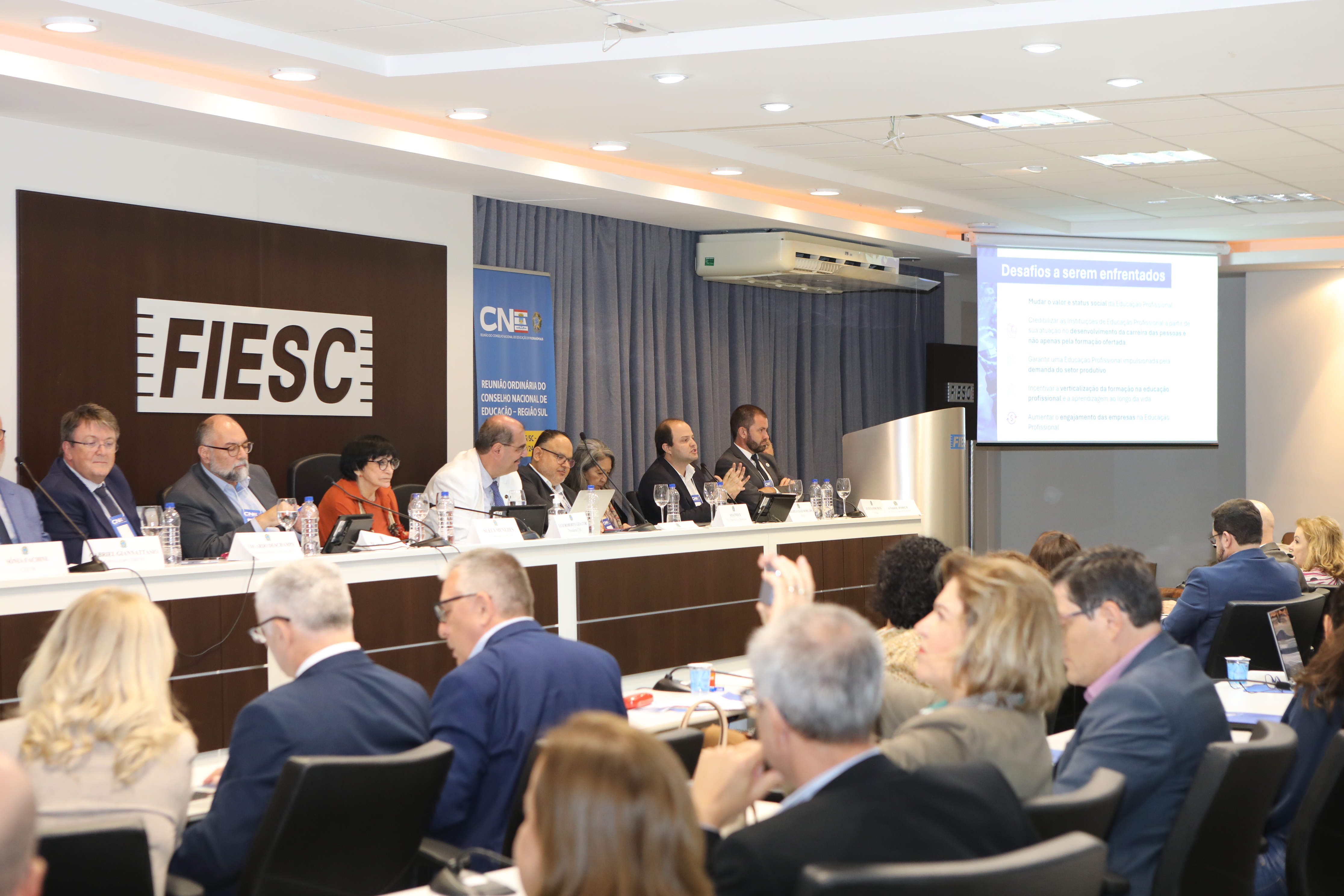 Florianópolis, 16.4.2024 - Reconhecido por sua expertise na oferta de educação profissional, o SENAI integrou a mesa de discussões sobre os desafios da educação profissional tecnológica em reunião do Conselho Nacional de Educação (CNE). O encontro, realizado na Federação das Indústrias (FIESC) nesta terça-feira, dia 16, contou com a participação do superintendente de Educação Profissional e Superior do SENAI Nacional, Felipe Morgado, e lideranças ligadas a entidades de ensino e pesquisa na área.