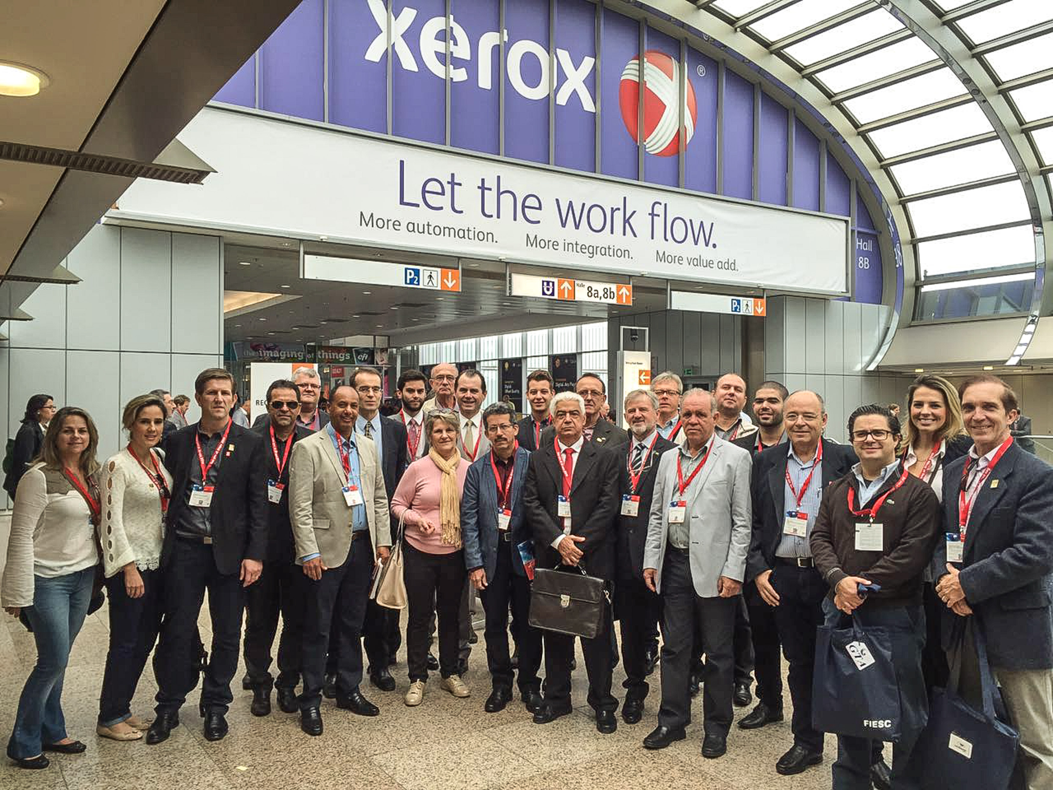 Florianópolis, 2.6.2016 – Empresários de Santa Catarina, Rio Grande do Sul e Alagoas participam na Alemanha da principal feira internacional da indústria gráfica e mídia, a Drupa, realizada em Düsseldorf. O evento tem 1.650 expositores de mais de 50 países, que integram os players globais do setor e apresentam as últimas tecnologias em eletrônica impressa, impressão 3D e suas aplicações industriais. A delegação é liderada pelo vice-presidente da Federação das Indústrias de Santa Catarina (FIESC) para o Vale do Itajaí, Ronaldo Baumgarten Júnior.