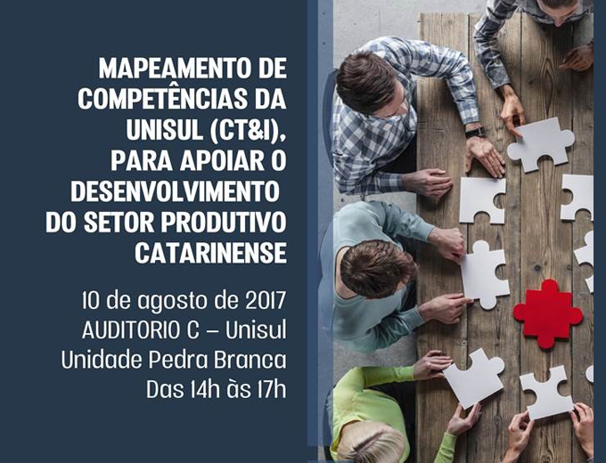 Florianópolis, 9.8.2017A Unisul realiza nesta quinta-feira, dia 10 de agosto, às 14 horas, no auditório do Bloco C da Unidade da Pedra Branca, o evento “Mapeamento de Competências da Unisul”. A iniciativa apoia o desenvolvimento do setor produtivo catarinense por meio do mapeamento das competências da Unisul em termos da Ciência, Tecnologia e Inovação (CT&I) e da sensibilização e potencialização da relação entre pesquisadores/provedores de soluções em CT&I. O encontro é aberto ao público interessado na temática proposta. O objetivo do evento é estimular os pesquisadores (prioritariamente vinculados aos Grupos de Pesquisa) a participarem do levantamento das competências de CT&I da Unisul, para ofertar pesquisas e prestação de serviços ao setor produtivo da sociedade. A iniciativa tem o apoio da FIESC.