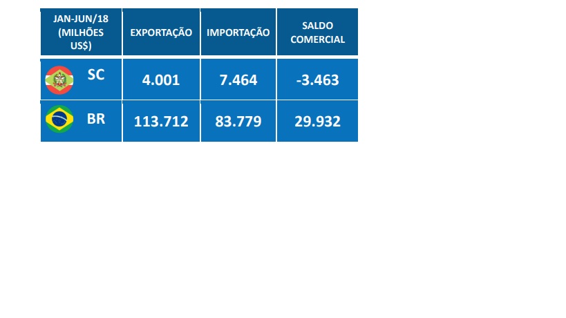 Florianópolis, 9.7.2018 – Influenciada principalmente pela queda nas vendas de carne, as exportações catarinenses de janeiro a junho caíram 4,2% em relação ao mesmo período em 2017 e somaram US$ 4,01 bilhões. Em comparação com os últimos seis anos, o desempenho do Estado está no patamar de 2016, ainda como reflexo da greve dos caminhoneiros, mostram dados do Ministério do Desenvolvimento (MDIC), divulgados pela Federação das Indústrias de Santa Catarina (FIESC). No acumulado do ano, Santa Catarina importou US$ 7,47 bilhões. O resultado é 28,8% maior que o registrado no mesmo período no ano passado. Clique aqui e veja os dados completos.