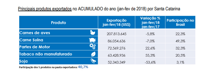 Florianópolis, 8.3.2018 – As exportações catarinenses no primeiro bimestre de 2018 totalizaram US$ 1,2 bilhão. O valor, que é o maior dos últimos quatro anos, representa uma variação de 0,7% frente ao mesmo período no ano anterior, informam os dados do Ministério da Indústria, Comércio Exterior e Serviços (MDIC), divulgados pela FIESC. Os destaques da participação na pauta exportadora no acumulado do ano são carne de aves, que ocupa a primeira posição (com recuo de 5,8% em relação a 2017), seguido pela carne suína (com decréscimo de 7%) e partes de motor (com avanço de 22,6%). No acumulado do ano, os principais bens exportados compreendem os intermediários (59,5%) e os bens de consumo (29,7%), enquanto os bens de capital correspondem a 10,6% do total. Clique aqui e veja os dados completos.