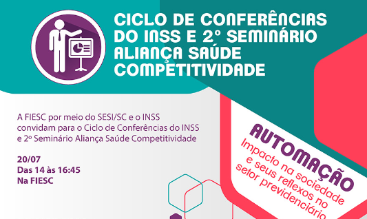 Florianópolis, 18.07.2017 – A FIESC, por meio do SESI, e o INSS promovem nesta quinta-feira (20) o Ciclo de Conferências do INSS e o 2º Seminário Aliança Saúde Competitividade. O evento, que ocorre a partir das 14 horas, na sede da entidade, discutirá o tema “Automação – o impacto na sociedade e seus reflexos no setor previdenciário”. O evento contará com palestras do presidente do INSS, Leonardo de Melo Gadelha, do gerente executivo de pesquisa e competitividade da CNI, Renato da Fonseca, e de Glauco José Côrte, presidente da FIESC.