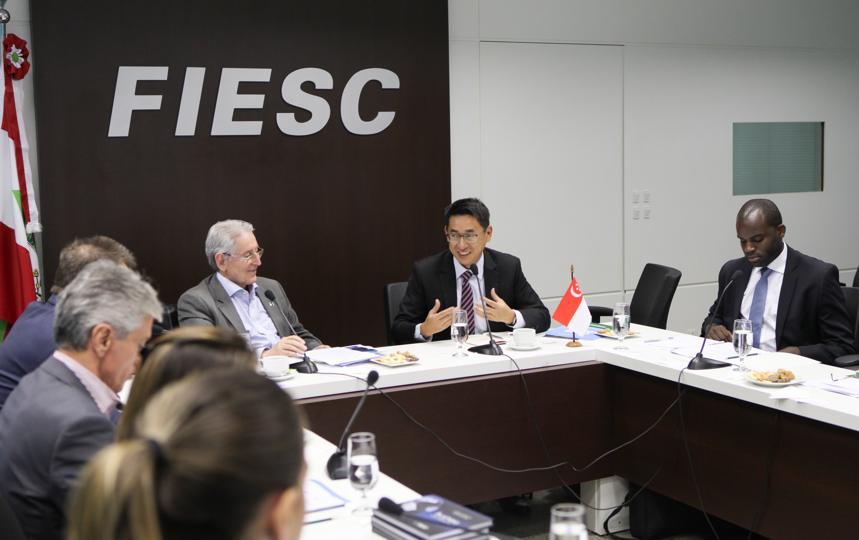 “O senhor Lee cumpriu rapidamente a promessa feita quando visitamos o porto de Cingapura no começo do mês”, disse o presidente da FIESC, dirigindo-se a Peng Gee Lee, executivo do operador portuário PSA. Lee apresentou a PSA International e esteve acompanhado de Joel Julius, gerente da International Enterprise Singapore, agência de promoção comercial vinculada ao Ministério de Comércio e Indústria da cidade-estado.