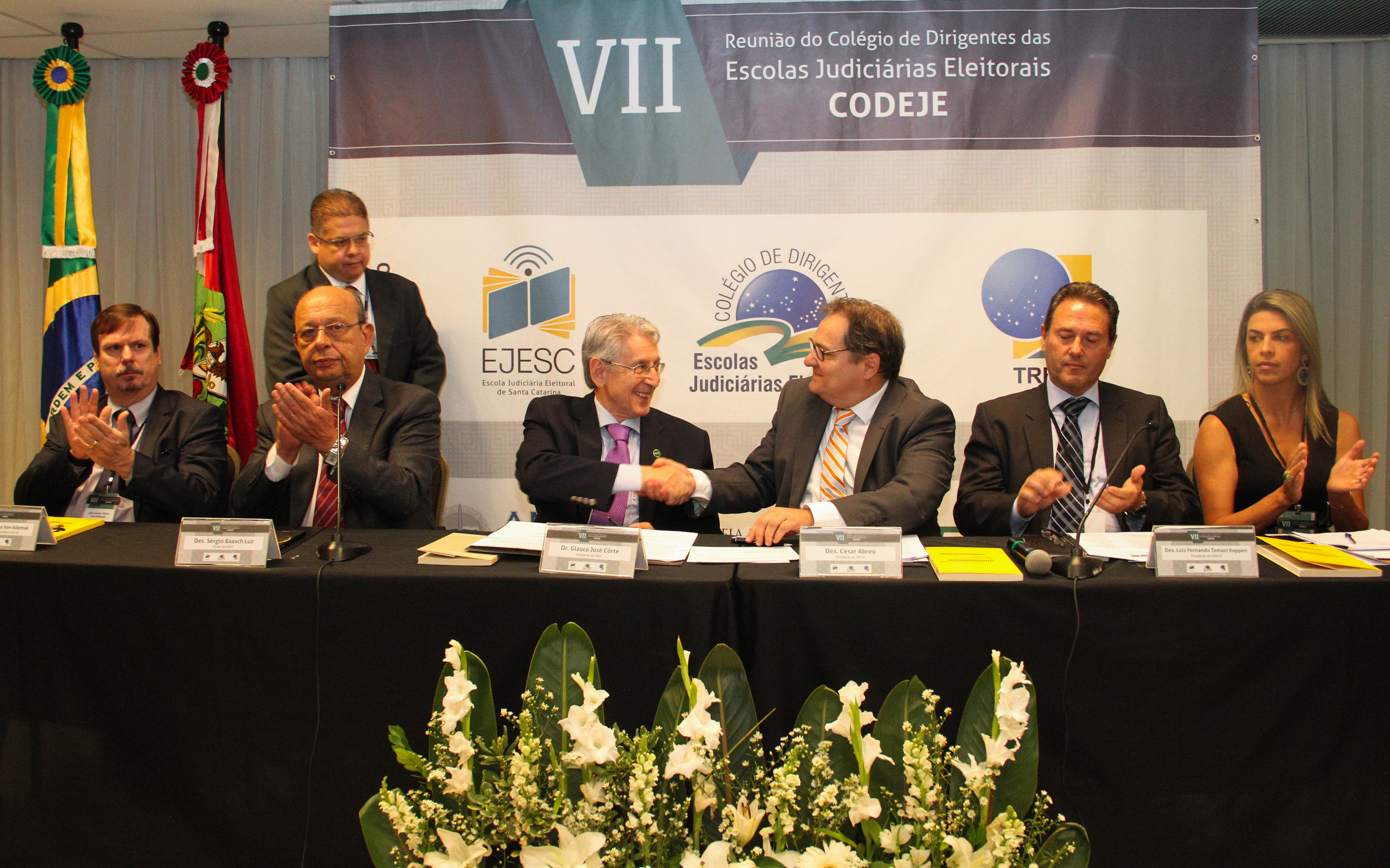 Florianópolis, 1º.4.2016 – A Federação das Indústrias de Santa Catarina (FIESC) e o Tribunal Regional Eleitoral (TRE-SC) firmaram convênio que prevê o apoio da Federação nas ações voltadas à cidadania e responsabilidade social promovidas pelo Tribunal, que tem buscado a parceria de instituições públicas e privadas para orientar os eleitores sobre seus direitos e deveres e as implicações das escolhas deles para o futuro da coletividade. O acordo foi assinado na manhã desta sexta-feira (1º), durante reunião do Colégio de Dirigentes das Escolas Judiciárias Eleitorais, em Florianópolis.