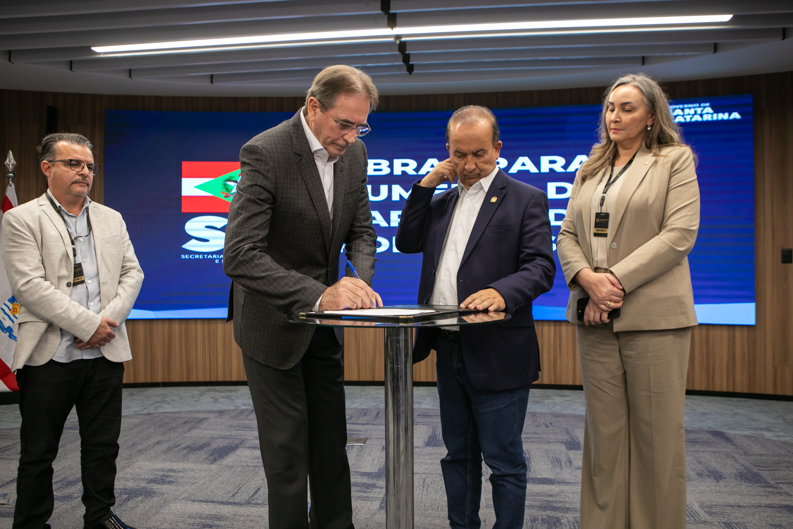 Florianópolis, 26.07.24 - O presidente da Federação das Indústrias de Santa Catarina (FIESC), Mario Cezar de Aguiar, recebeu nesta sexta-feira, 26, o governador do estado Jorginho Mello, que apresentou o projeto executivo para a melhoria da SC-401. Na solenidade, eles assinaram a autorização da abertura da licitação das obras de aumento de capacidade da rodovia.