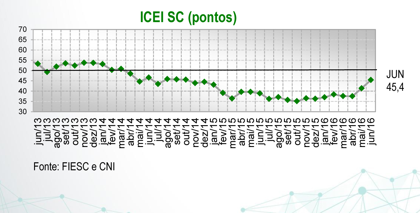 Florianópolis, 17.06.2016 – A avaliação do cenário econômico pelos industriais catarinenses teve alta de quatro pontos, atingindo 45,4 pontos em junho. Este é o segundo mês seguido de alta e o maior nível desde de outubro de 2014, mas o indicador segue abaixo da média histórica, de 53,3 pontos, e da linha que indica otimismo, de 50 pontos. Os dados integram pesquisa divulgada pela Federação das Indústrias de Santa Catarina (FIESC) nesta sexta-feira (17).