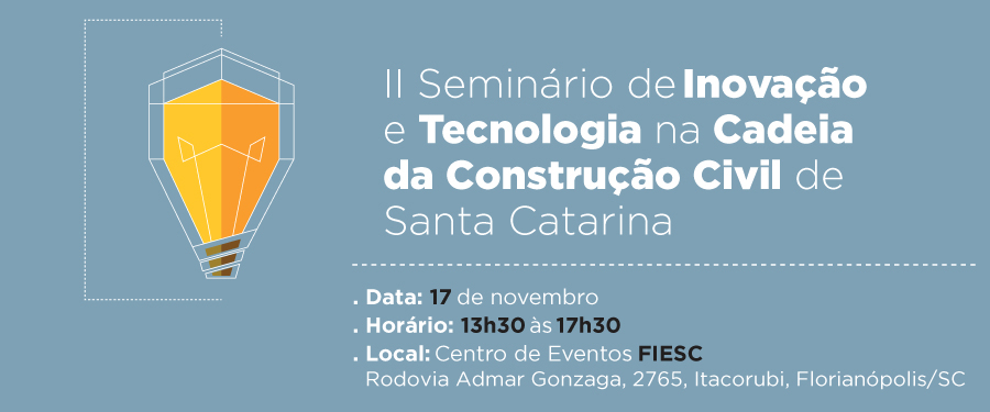 Florianópolis, 16.11.2016 – A Federação das Indústrias de Santa Catarina (FIESC), por meio do IEL, realiza nesta quinta-feira (17) o segundo seminário de inovação e tecnologia na construção civil. O encontro ocorre na FIESC, em Florianópolis, a partir das 13h30. As indústrias catarinenses Termotécnica, Ekomposit do Brasil, Tecnofibras, Ciser Parafusos e Porcas, Sandritec Tecnologia e Vitaciclo S/A relatarão práticas inovadoras no setor que resultaram em ganhos significativos.
