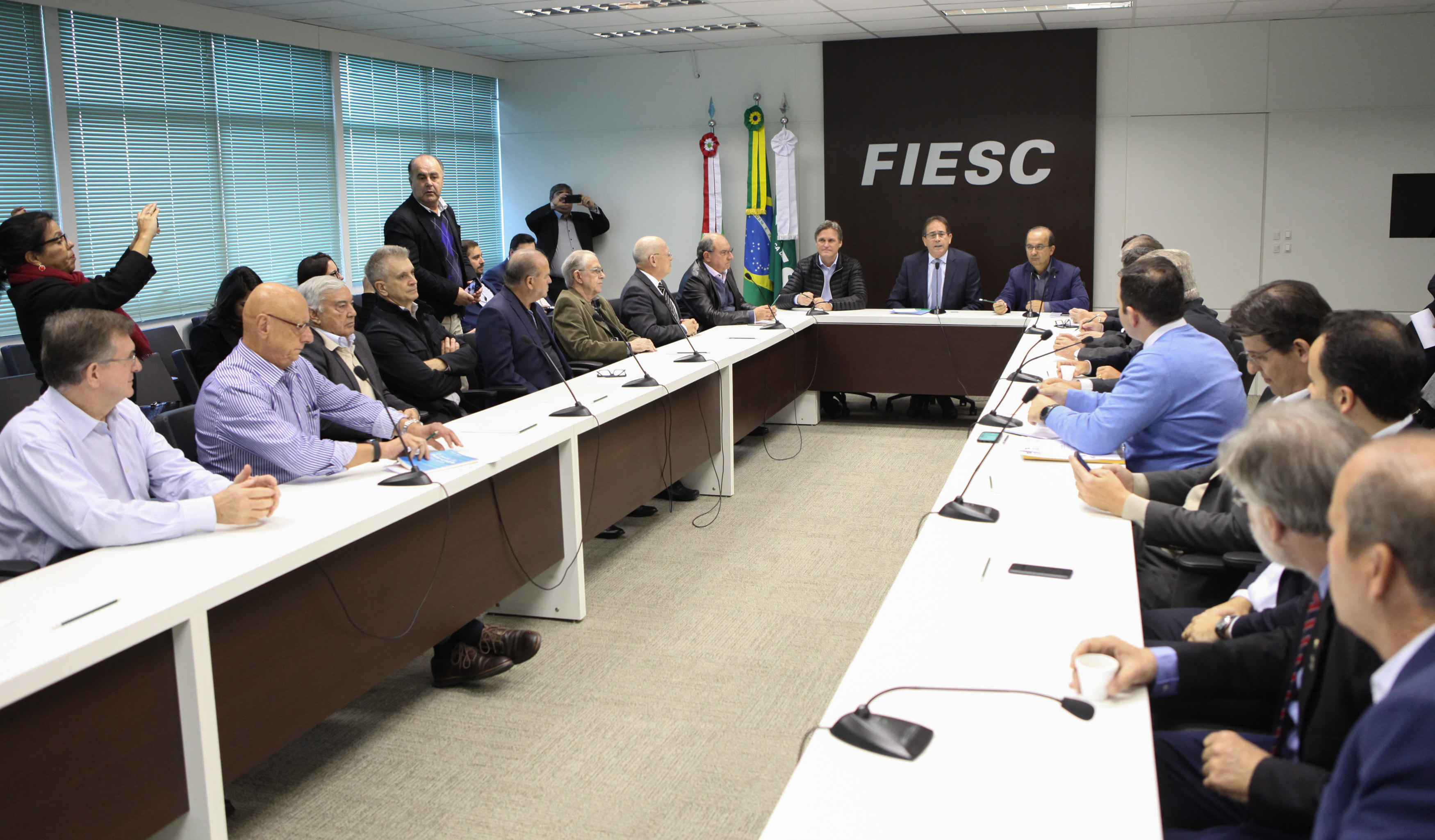 Florianópolis, 4.6.2018 – Lideranças catarinenses debateram propostas para minimizar os impactos sofridos por Santa Catarina com a paralisação dos caminhoneiros. O encontro, realizado nesta segunda-feira (4), em Florianópolis, foi proposto pelo deputado Jorginho Mello, coordenador do Fórum Parlamentar Catarinense. A reunião ocorreu na Federação das Indústrias de Santa Catarina (FIESC) com a participação de representantes de federações empresariais que integram o Conselho das Federações Empresariais de Santa Catarina (COFEM), deputados, senadores, representantes da FECAM e secretários de Estado que atuaram no comitê de crise do governo catarinense. O COFEM vai elaborar uma proposta com sugestões e encaminhar ao Fórum. Entre elas devem constar proposições relativas à facilitação de acesso ao crédito e postergação de recolhimento de tributos.
