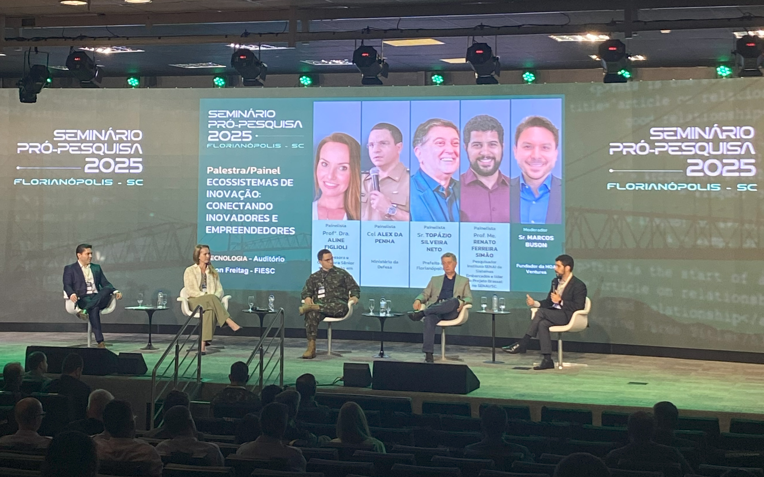 Florianópolis, 17.09.2025 - A programação do Seminário Pró-Pesquisa, realizado na FIESC, incluiu um painel que trouxe reflexões sobre o caminho da pesquisa científica até a aplicação prática no mercado. O debate reuniu o pesquisador Renato Simão, coordenador do Instituto SENAI de Inovação em Sistemas Embarcados, Alex da Penha, do Ministério da Defesa, o prefeito de Florianópolis, Topázio Neto, e a especialista em ecossistemas de inovação Aline Figlioli conectando perspectivas da ciência, da indústria e do poder público.