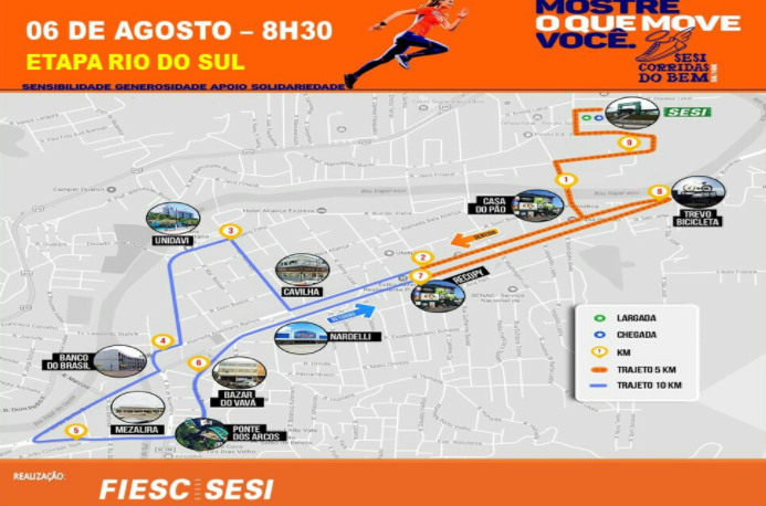 Em Rio do Sul, o SESI Corridas do Bem é realizado em conjunto com a APAE, entidade beneficiada. A iniciativa pretende estimular, além da adoção de hábitos saudáveis e o contato entre os atletas, fazer o bem por meio da prática do voluntariado. Até o final do ano, as Corridas do Bem terão contabilizado 16 etapas e parte dos recursos gerados será revertida para instituições beneficentes.