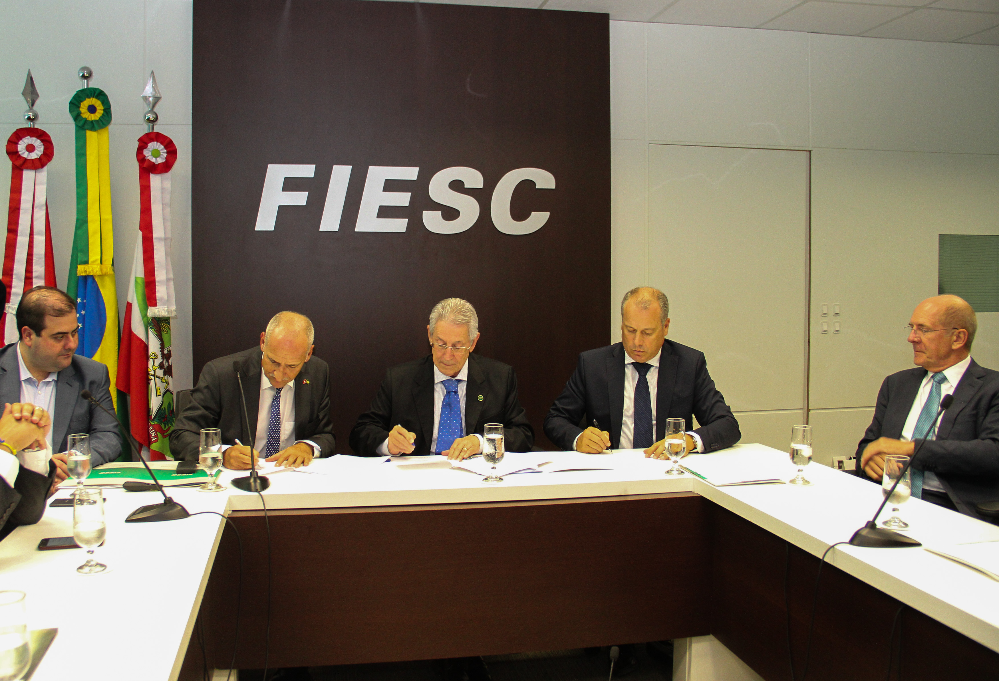 Florianópolis, 08.3.2016 – A Investe SC, agência que surgiu de parceria entre a Federação das Indústrias de Santa Catarina (FIESC) e o Governo de Santa Catarina, assinou acordo de cooperação com a congênere suíça Switzerland Global Enterprise (S-GE) para promover investimentos e o comércio bilateral do Estado com o país europeu. O termo foi assinado nesta terça-feira, dia 8, pelo presidente da FIESC, Glauco José Côrte; o embaixador da Suíça no Brasil; André Regli, e os secretários de Estado catarinenses Carlos Chiodini (Desenvolvimento Econômico Sustentável) e Carlos Adauto Virmond Vieira (Assuntos Internacionais).