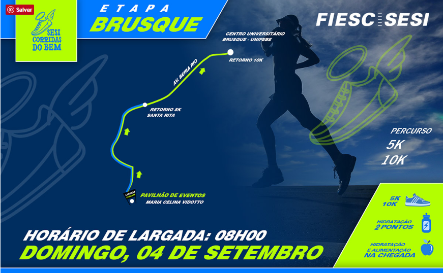 Florianópolis, 02.09.2016 – Brusque recebe neste domingo (04) a Corrida do Bem, evento promovido pelo SESI/SC, entidade da FIESC. A iniciativa, que conta também com a modalidade de caminhada e terá parte do valor das inscrições revertida para uma instituição de amparo social da cidade, é destinada aos industriários e comunidade.