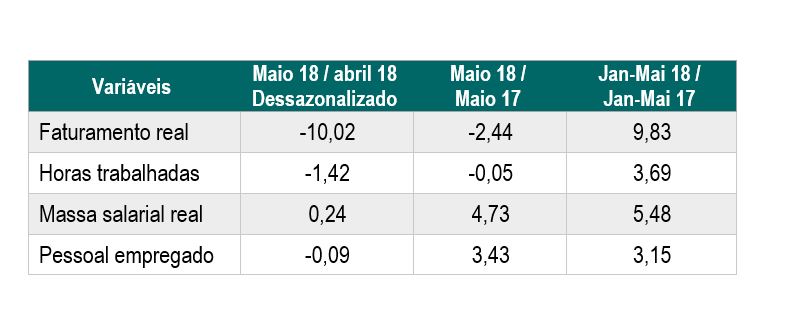 De janeiro a maio em relação ao acumulado de 2017, o faturamento cresceu em 12 das quatorze atividades pesquisadas. As maiores ampliações estão em vestuário e acessórios (35,2%), produtos de metal (22,8%) e produtos alimentícios (22,3%). Entre os segmentos que registraram queda estão celulose e papel (-5,2%), borracha e material plástico (-0,6%) e produtos têxteis (0,5%). No mesmo período, o desempenho da massa salarial aumentou 5,5%, com crescimento em 13 segmentos consultados. Os destaques ficaram com informática e eletrônicos (20,8%), móveis (13,8%) e produtos de metal (12,7%). Clique aqui e veja os indicadores completos